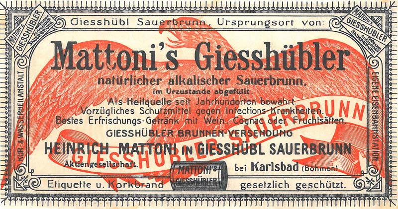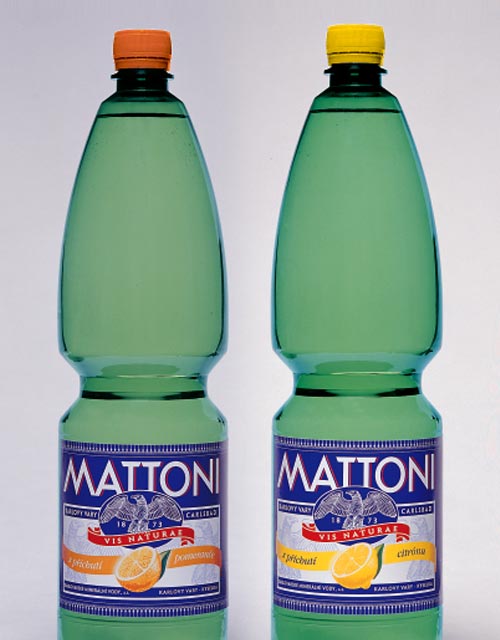 Первой новинкой от Маттони стали стеклянные бутылки с бумажной этикеткой. Красный орел на этикетке заимствован с родового герба Маттони. Бутылки, предназначенные для заокеанских стран, были армированы проволокой.